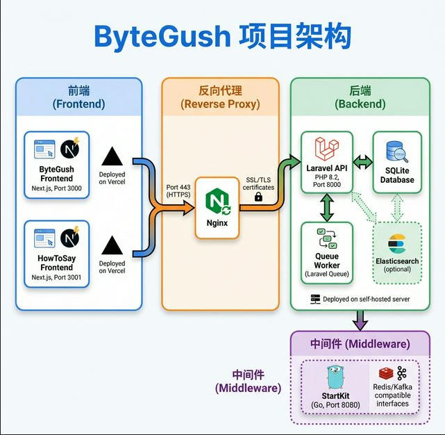 在经过了多轮的尝试,在权衡性能和效率之后,终于把网站的架构稳定下来。这是一个融合PHP,GoLang,Nextjs的多语言项目架构。Nextjs作为部署在Vercel的前端,承载了Bytegush主站和HowtoSay主站的前端主要功能。后端则部署在单服务器上,利用高效成熟的PHP Laravel框架可以快速开发接口和简单的HTML页面,利用GoLang轻量和高并发的能力,作为一个辅助的中间件,可提供缓存,搜索,监控等服务,取代过重的Redis,Elastics Search等服务,在低内存和性能的服务器上也能够运行。最后再加上Nginx来做反向代理,就称为一个麻雀虽小,五脏俱全的服务。